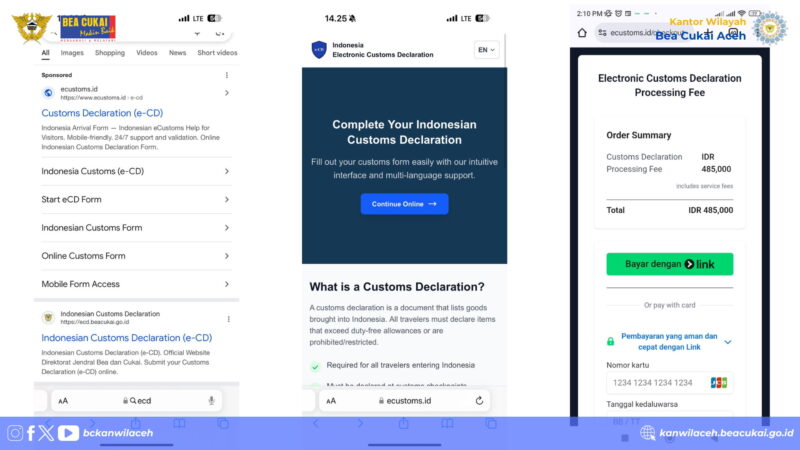 Banda Aceh, [19 Agustus 2025] — Kantor Wilayah Direktorat Jenderal Bea dan Cukai (DJBC) Aceh mengimbau masyarakat, khususnya para pelancong dari luar negeri yang akan memasuki wilayah Indonesia, untuk mewaspadai situs palsu dengan alamat Ecustoms.id yang mengatasnamakan sistem Electronic Customs Declaration (ECD) Indonesia.