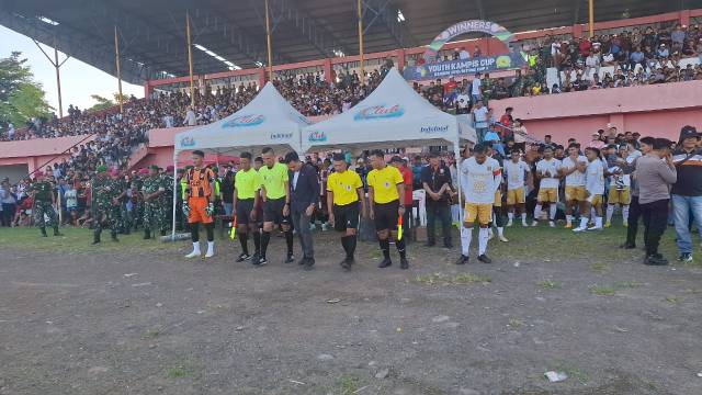 Partai puncak turnamen sepak bola Youth Kampis Cup memperebutkan Dandim 1310/Bitung Cup I sukses digelar di Stadion Dua Sudara, Kota Bitung, Minggu (7/9/2025) sore. Ribuan penonton memadati stadion untuk menyaksikan laga final yang mendapat pengamanan ketat dari ratusan aparat Polri dan TNI.
