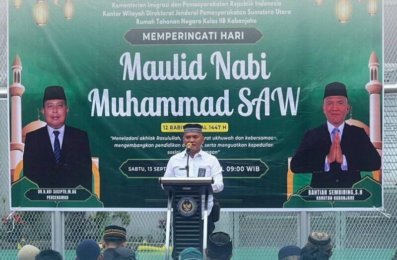 KABANJAHE KARO,Indonesia24News.Net| Warga Binaan Pemasyarakatan (WBP) Rumah Tahanan Negara (Rutan) Kelas IIB Kabanjahe, Kabupaten Karo, Sumatera Utara, larut dalam kehangatan peringatan Maulid Nabi Muhammad SAW 1447 H, pada hari Sabtu (13/9/2025). Acara ini tidak hanya menjadi momen untuk memperingati hari lahir Nabi, tetapi juga sebagai sarana pembinaan mental dan spiritual bagi seluruh WBP.