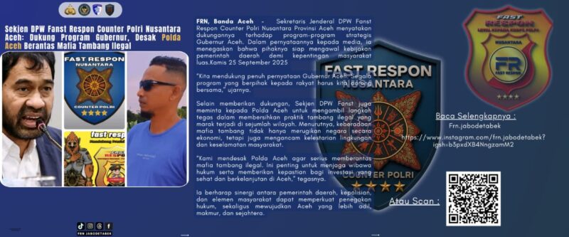 BANDA ACEH  — Dewan Pimpinan Wilayah (DPW) Fanst Respon Counter Polri Nusantara Provinsi Aceh menyatakan dukungan penuh terhadap program-program strategis Gubernur Aceh. Dalam keterangannya kepada media, Kamis (25/9/2025), Sekretaris Jenderal DPW Fanst menegaskan komitmen pihaknya untuk mengawal kebijakan pemerintah daerah yang berpihak pada kepentingan rakyat.